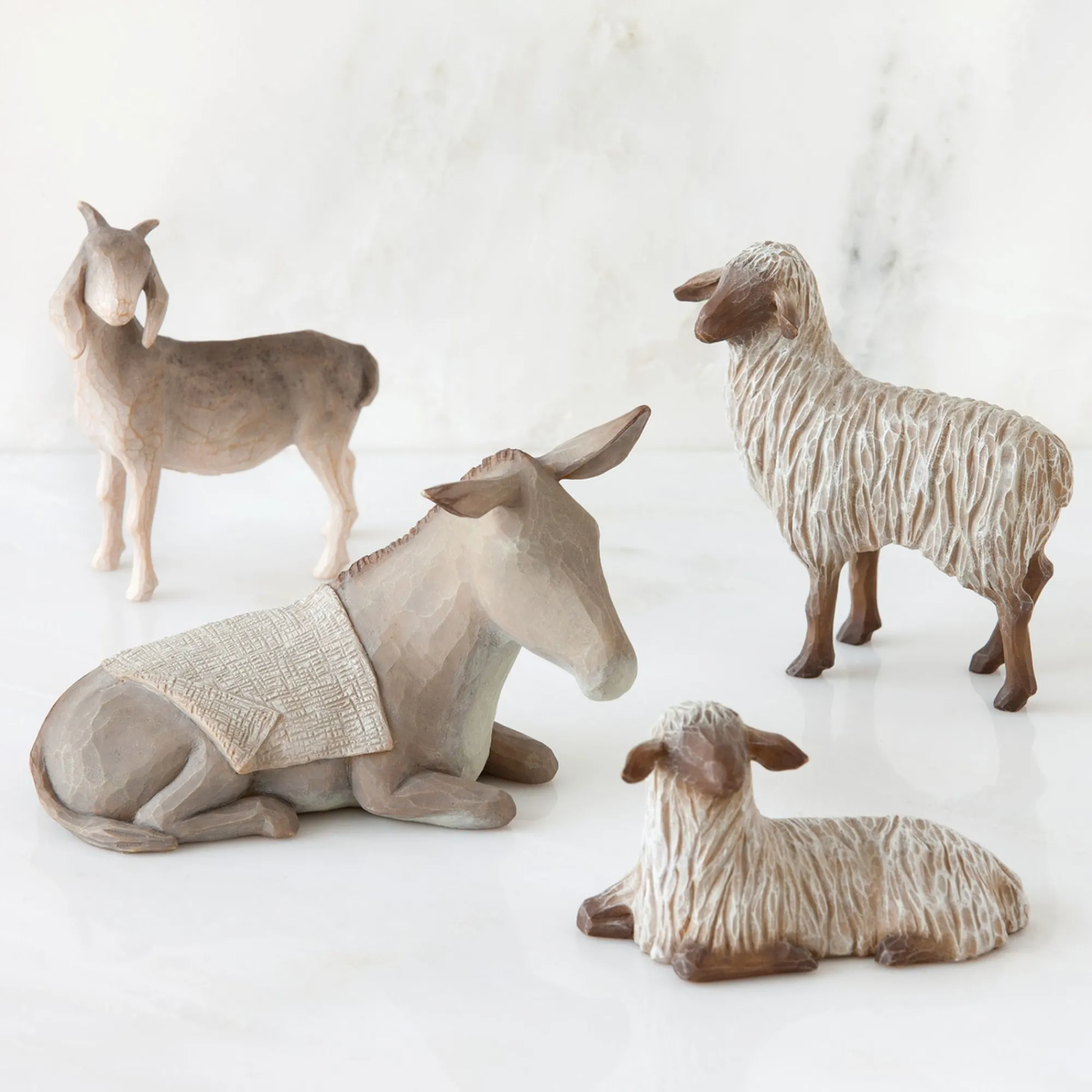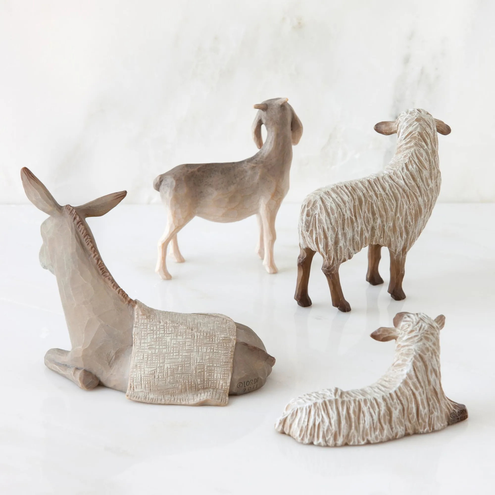 This Four-Piece Set Of Animals Was Designed To Specifically Fit The Small, Intimate Scale Of The Holy Family.The Sheltering Animals Are Proportional In Scale To The Holy Family… Smaller Versions Of Other Animals I’Ve Carved, With A Few Little Tweaks In The Details. I Like That The Gestures Of Their Heads And Ears Express Watchful Attentiveness. My Favorite Is The Goat – He Shows His Personality In His Stance! –Susan Lordi